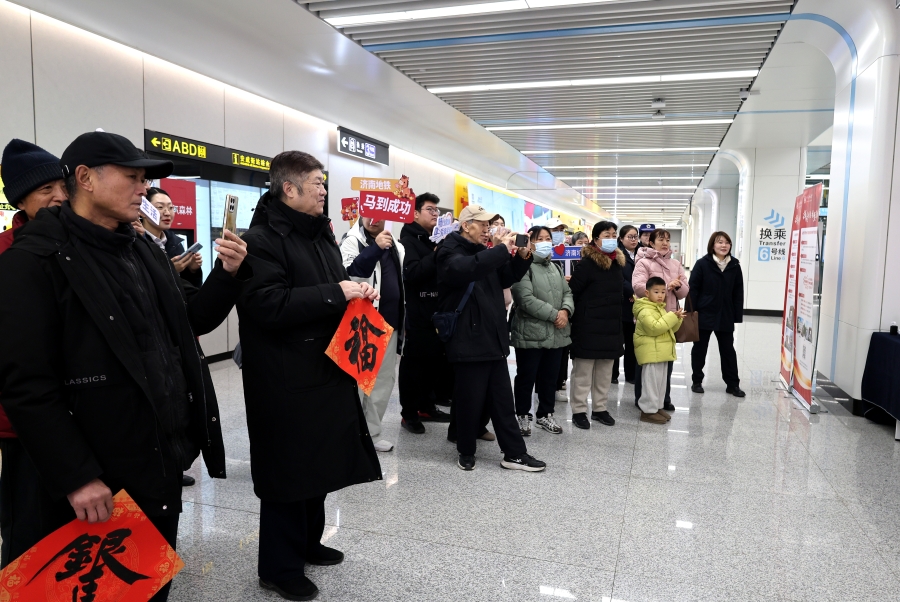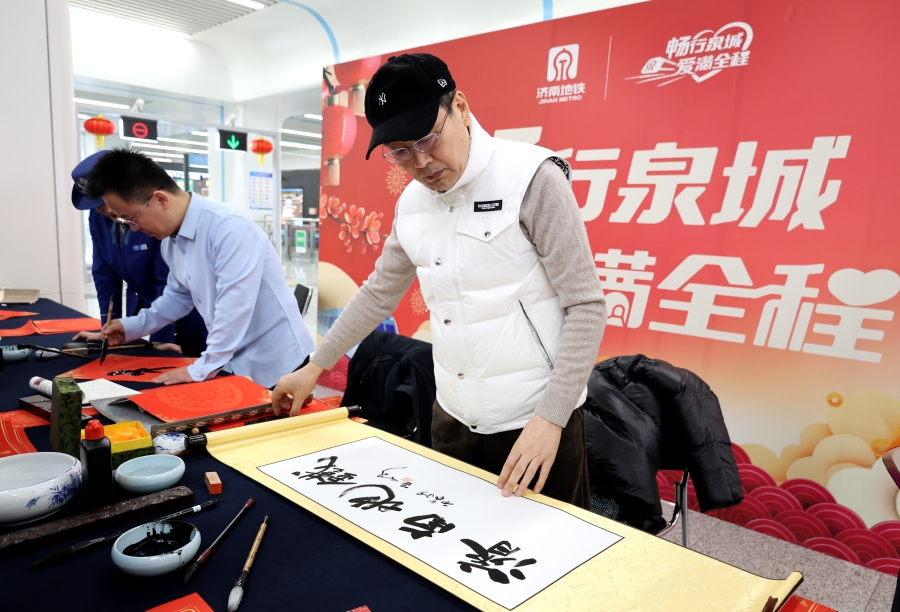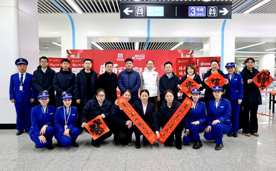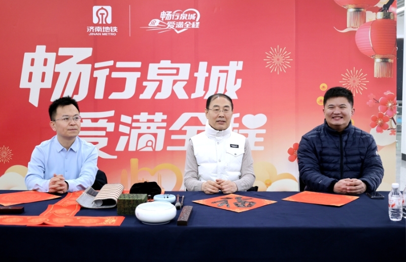 活动特邀中国书法家协会理事、山东省政协常委、山东开放大学书法学院院长孟鸿声,山东省书法家协会副秘书长马涛,山东开放大学书法学院书法专业负责人谷元江现场挥毫,与地铁工作人员一道,为往来市民书写春联、题写“福”字,将美好的新春祝愿融入笔墨,温暖市民出行之路。